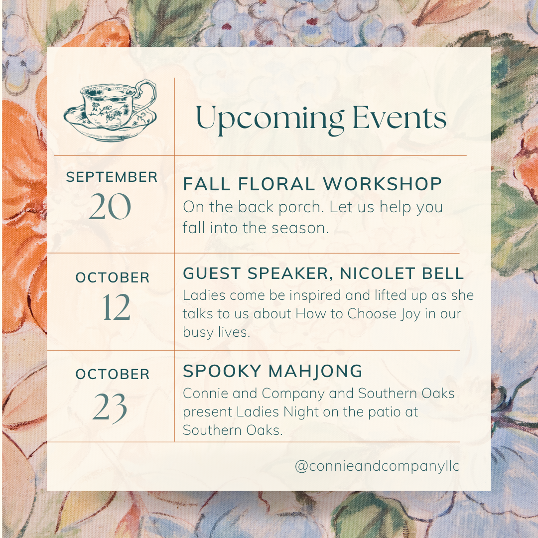 Connie & Company is a platform for women of all ages and backgrounds to bloom, blossom, & grow through authentic fellowship. We believe that the strongest relationships are formed through creativity, conversation, and collaboration – all fostered and celebrated at our events. Through small groups, workshops, and other activities, our goal is to share our creative gifts and do life together – woman to woman, blessing for blessing.